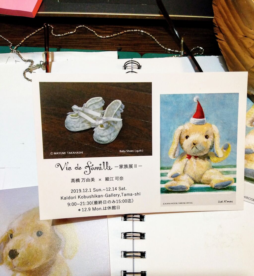 2019.10.31 17:05Vie de famille ー家族展Ⅱー12/1(日)~12/14(土) kaidori kobushikan Gallery9:00~21:30(最終日は15:00まで)*12/9(月)は休館日キルト作家の髙橋 万由美さんと”家族”をテーマにした2人展をします。お気軽にお立ち寄りください細江可奈フォロー2019.12.01 12:30Vie de Famille -家族展Ⅱ‐ 始まりました0コメント1000 / 1000投稿